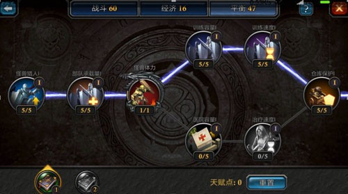4、平衡天赋的加点,平衡天赋在发展过程中起着很大作用,因为它在发育时对各个建筑的属性加成包括医院容量、训练速度和其他很多地方都有加速和提升。这个加点也建议全部往后面加。加点稍微复杂的就是战斗天赋的加成,另外一点大家记得注意使用天赋技能,比如使用立即生产立马从城里田中收取五小时采集量,使用三秒回兵坑打你的人这些都是很实用的技能。