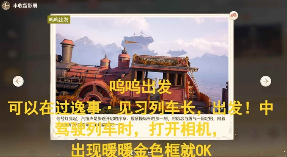在逸事·见习列车长,出发!中找到小娜,驾驶列车,登上列车后,打开相机,出现暖暖金色框即可;