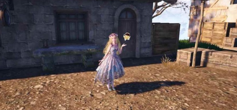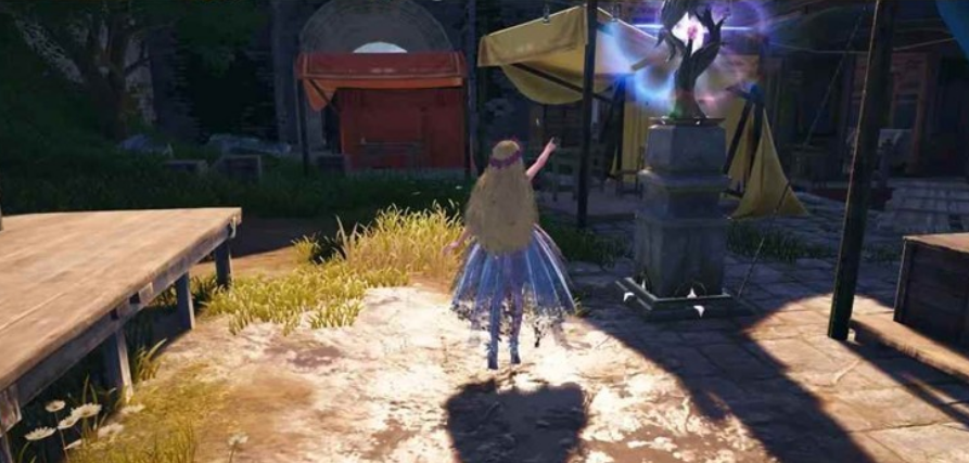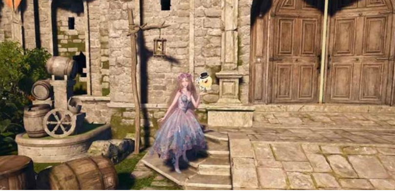 位置:传送落地后向身后走,经过一个木质拱门后,史丢丢在路右侧最大的木桶后面。
