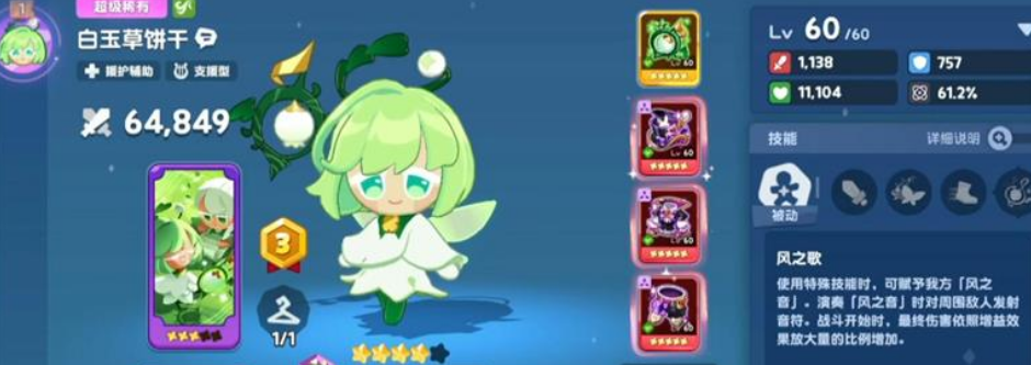 白玉草饼干在饼干人联盟中定位为兼具辅助与一定输出能力的超级稀有角色,满级60级时拥有11104的生命值、1138攻击力和757防御力,基础属性偏向生存向,同时具备61.2%的效果命中,这使得其技能触发更加稳定。高效果命中配合被动机制,能在战斗中持续提供增益与间接伤害,是队伍中不可忽视的功能核心。其生命值保障了在前线的存活能力,而攻击力达到同级别输出饼干的70%,意味着在辅助之余也能贡献可观的附加伤害。