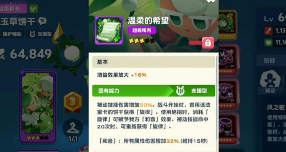 温柔的希望是白玉草饼干的核心选择,这张超级稀有卡牌能使其被动伤害提升50%,并在战斗开始时直接获得一段旋律。使用绝招后可消耗旋律释放和音效果,使全队全属性伤害提升32%,持续15秒。虽然技能冷却较长,但增益效果显著且稳定。配合被动命中20次即可重新获取旋律的机制,能够在长时间战斗中多次释放和音,极大提升团队爆发窗口。此外,稀有级法宝卡疾风耳语可让白玉草每次触发风之歌时有30%概率回复1点旋律值,进一步加快旋律积攒速度,增强技能循环流畅性。
