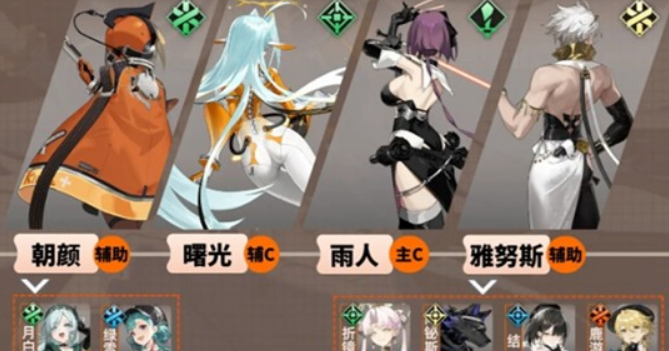 是目前最适合曙光的配队组合。该阵容以雨人为核心输出,曙光作为辅C提供关键的减防和易伤效果,能够降低敌方60%的物理防御,并附加45%至90%的易伤状态,极大提升雨人的单体爆发能力。朝颜作为功能性辅助,不仅能为信相角色提供攻击与防御加成,还能在关键时刻释放大量治疗,保障曙光的生存能力。雅努斯则通过持续回血和技能频率叠加,稳定维持全队血线,同时其战术技能可进一步强化雨人的暴击率与攻击力。此外,月白绿雪可替代朝颜,两者均具备攻击增益与群体回复能力;鹿游可替换雅努斯用于加快主C能量积攒,折镜、结或阿铋斯也是可行的替补选择。