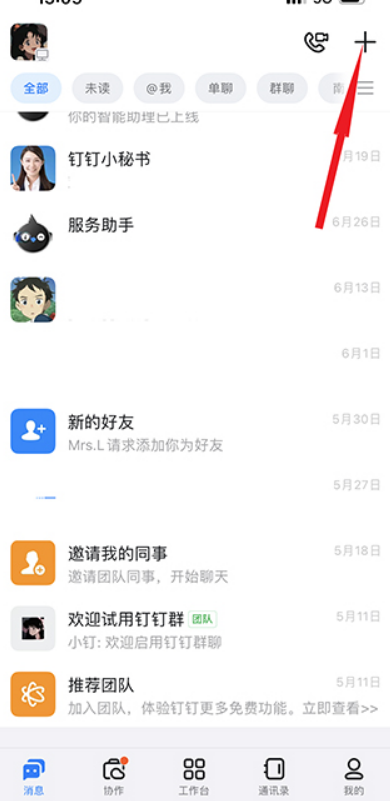 打开钉钉,进入首页后点击屏幕右上角的“加号”按钮;