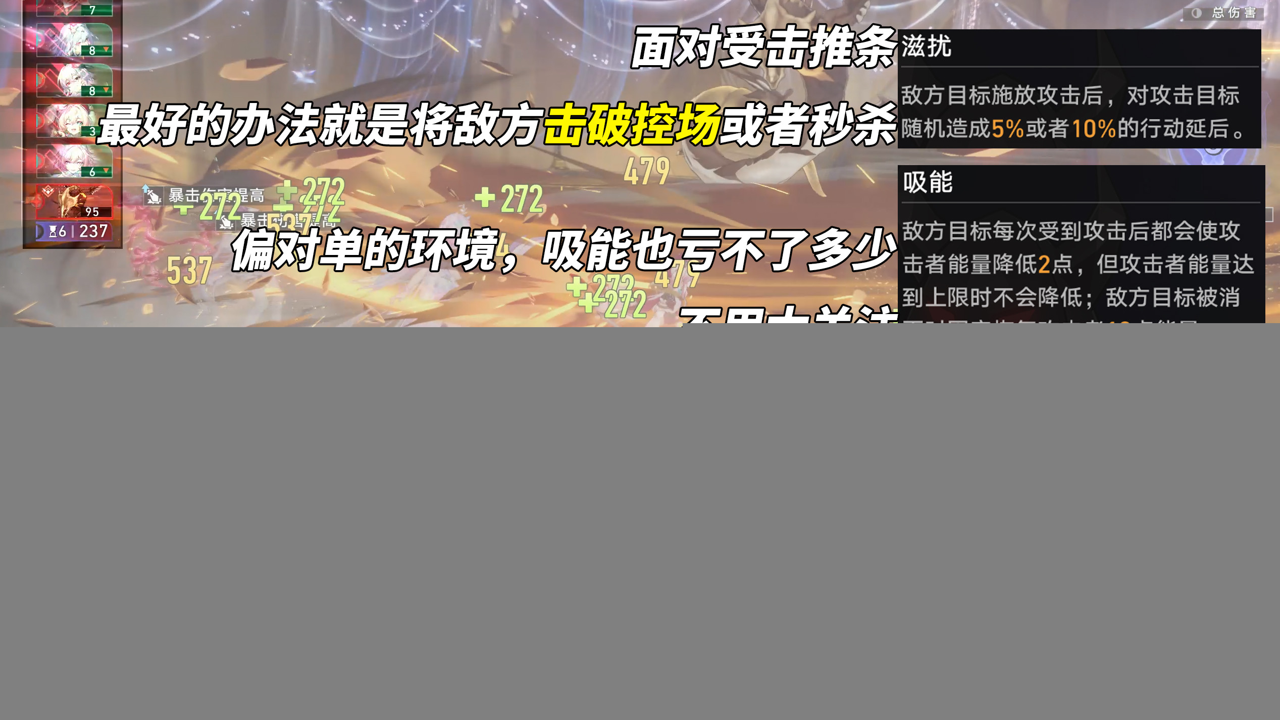 本关基本上可忽视环境异常,只考虑敌方即可。尤其是第2波蕉研组,通过提前囤1个辅助终结技,在充能电视行动时放终结技插队,可使其连充2次!