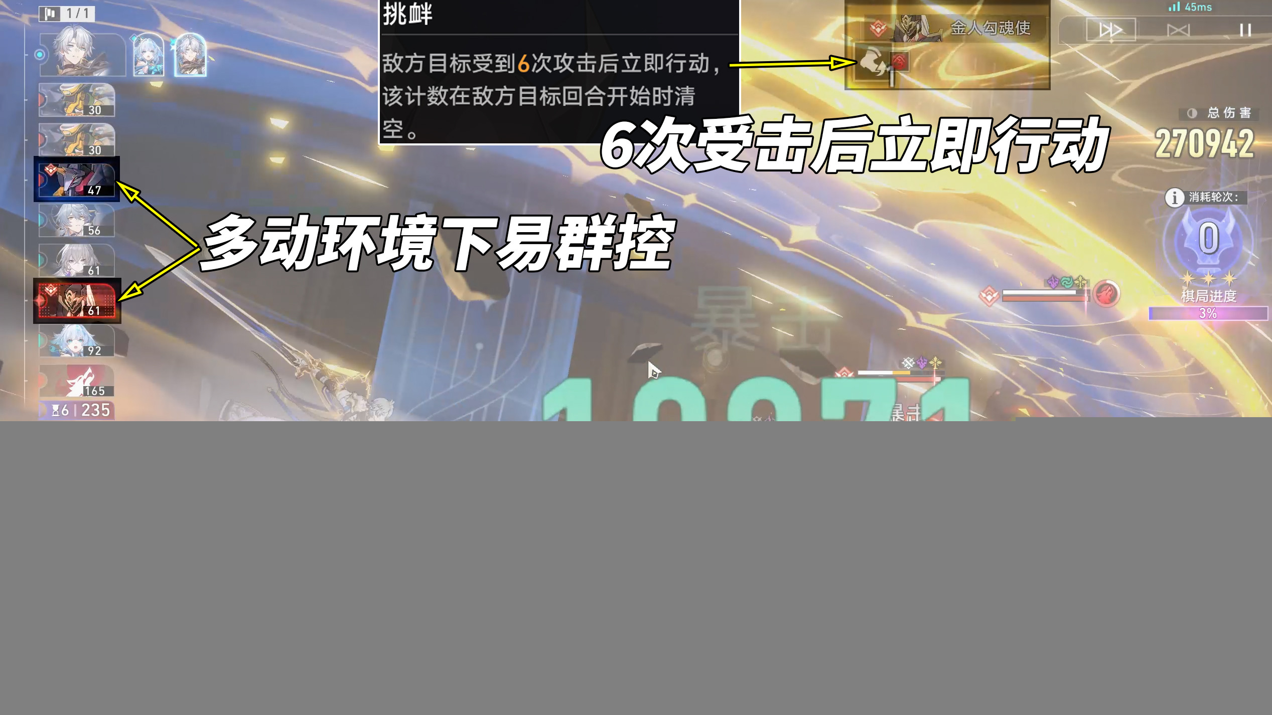 当“敌方多动”遇上“金人勾魂使”、“咆哮灵柩”,直接产生质变,我方极易被连环控制打乱节奏。这种情况显然利好DOT队、反击队、烧血队敌方变相助力输出,击破队则被反向克制韧性条恢复过快。且最好选择免疫控制/高速自解负面的主C,其次考虑高频解除负面的辅助。