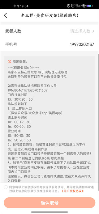最后在排队取号详细页面中,选择就餐人数后点击确认取号